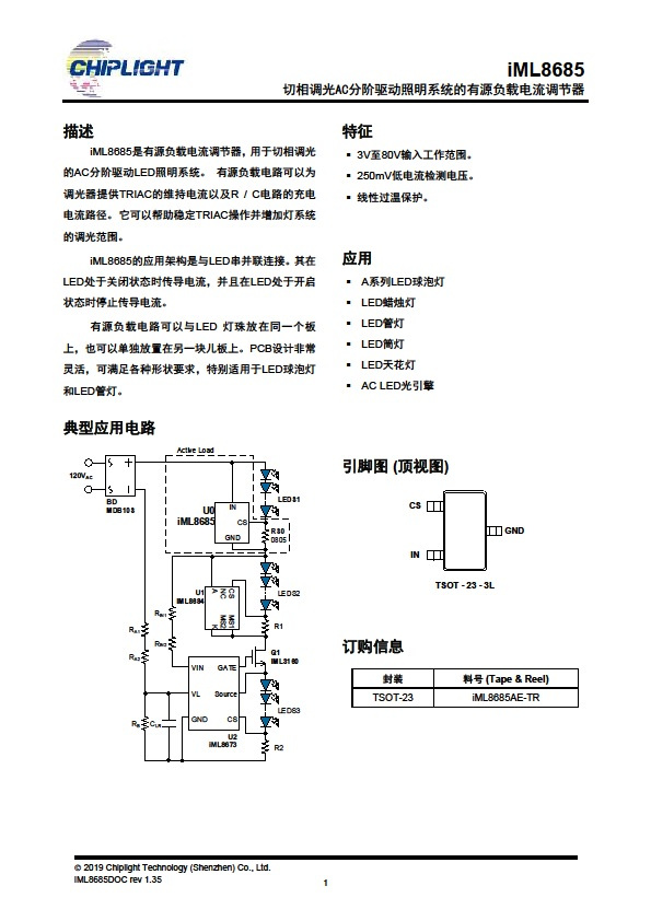 iML8685是有源負載電流調(diào)節(jié)器,用于切相調(diào)光的AC分階驅(qū)動LED照明系統(tǒng)。有源負載電路可以為調(diào)光器提供TRIAC的維持電流以及R/C電路的充電電流路徑。它可以幫助穩(wěn)定TRIAC操作并增加燈系統(tǒng)的調(diào)光范圍。