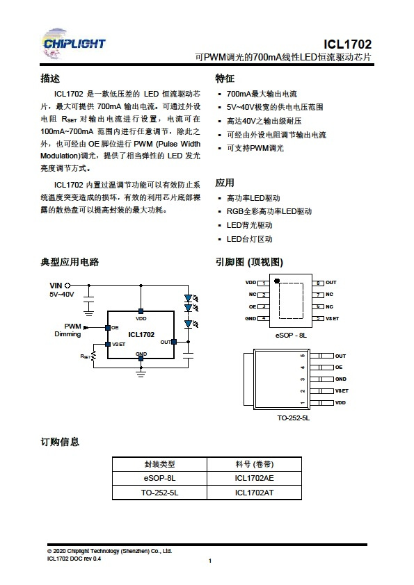 ICL1702 是一款低壓差的 LED 恒流驅(qū)動芯片,最大可提供 700mA 輸出電流??赏ㄟ^外設(shè)電阻 RsET 對輸出電流進(jìn)行設(shè)置,電流可在100mA~700mA 范圍內(nèi)進(jìn)行任意調(diào)節(jié),除此之外,也可經(jīng)由 OE腳位進(jìn)行 PWM(Pulse WidthModulation)調(diào)光,提供了相當(dāng)彈性的 LED 發(fā)光亮度調(diào)節(jié)方式。