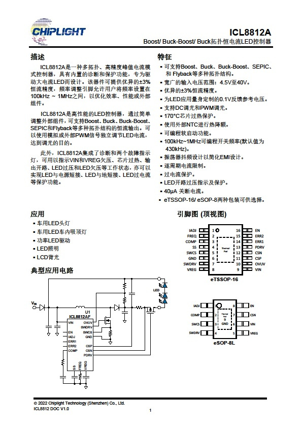 ICL8812A是一種多拓?fù)?、高精度峰值電流模式控制器,具有?nèi)置的診斷和保護(hù)功能,專為驅(qū)動大電流LED而設(shè)計。該器件可提供優(yōu)異的±3%恒流精度,頻率調(diào)整引腳允許用戶將頻率設(shè)置在100kHZ~ 1MHz之間,以優(yōu)化效率、性能或外部組件。