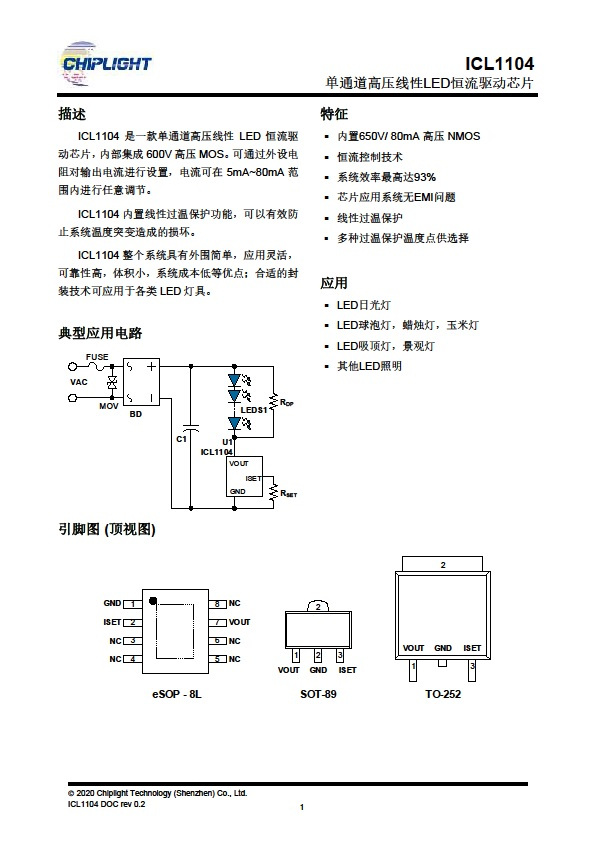 ICL1104 是一款單通道高壓線性 LED 恒流驅(qū)動芯片,內(nèi)部集成 600V 高壓 MOS??赏ㄟ^外設(shè)電阻對輸出電流進行設(shè)置,電流可在 5mA~80mA 范圍內(nèi)進行任意調(diào)節(jié)。