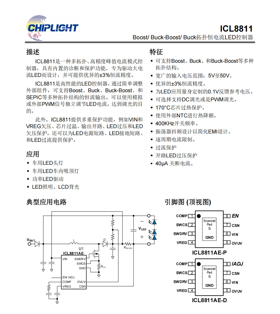 ICL8811是一種多拓?fù)洹⒏呔确逯惦娏髂J娇刂破?,具有?nèi)置的診斷和保護(hù)功能,專為驅(qū)動(dòng)大電流LED而設(shè)計(jì),并可提供優(yōu)異的+3%恒流精度。