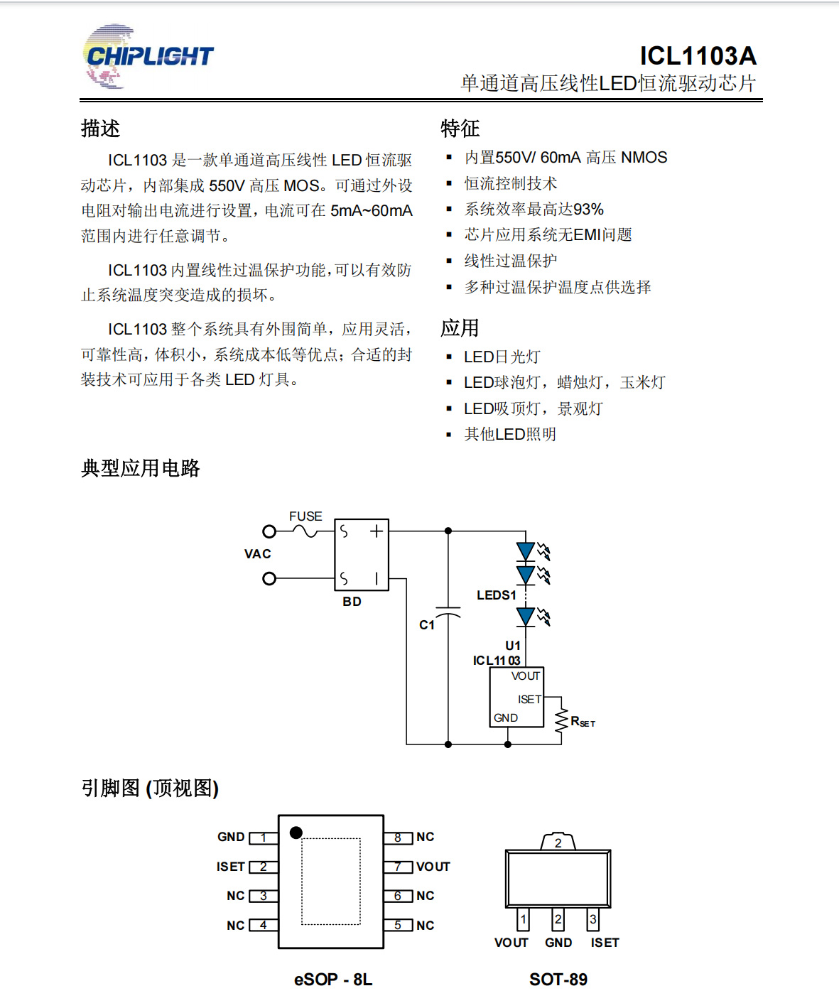 ICL1103 是一款單通道高壓線性 LED 恒流驅(qū)動(dòng)芯片,內(nèi)部集成 550V 高壓 MOS。可通過(guò)外設(shè)電阻對(duì)輸出電流進(jìn)行設(shè)置,電流可在 5mA~60mA范圍內(nèi)進(jìn)行任意調(diào)節(jié)。