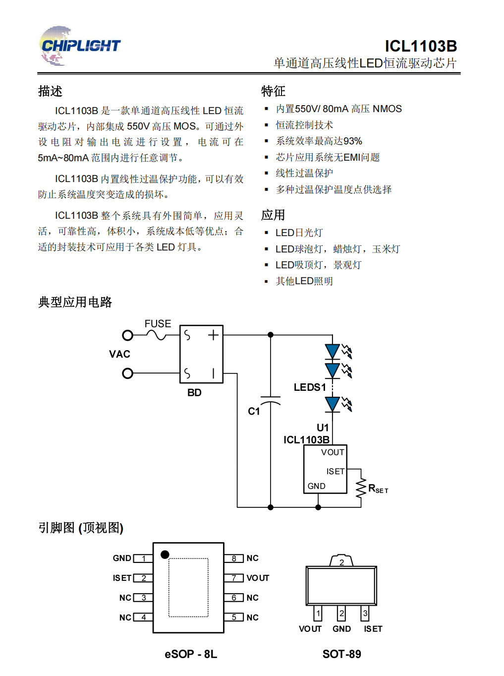 ICL1103B 是一款單通道高壓線性 LED 恒流驅(qū)動(dòng)芯片,內(nèi)部集成 550V 高壓 MOS??赏ㄟ^(guò)外設(shè)電阻對(duì)輸出電流進(jìn)行設(shè)置,電流可在5mA~80mA 范圍內(nèi)進(jìn)行任意調(diào)節(jié)。